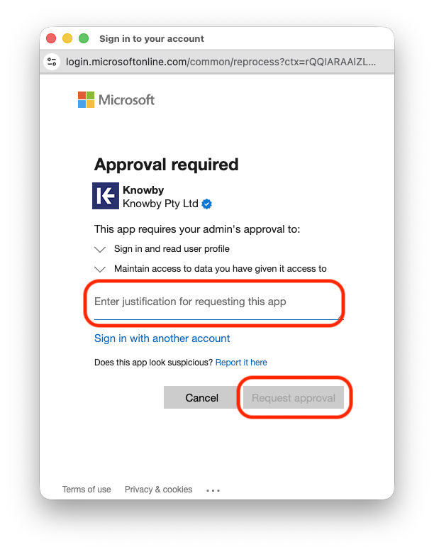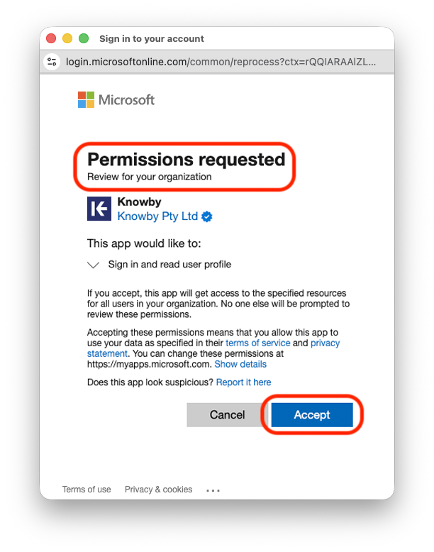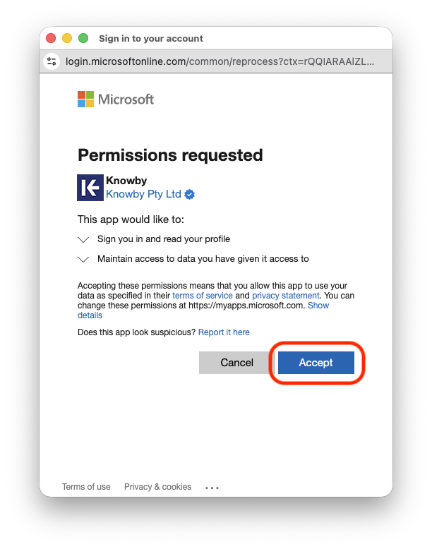 Review Permissions: A "Permissions requested" window will appear. The blue tick next to Knowby Pty Ltd will show that Knowby is a Verified Publisher.
