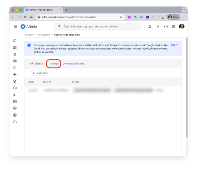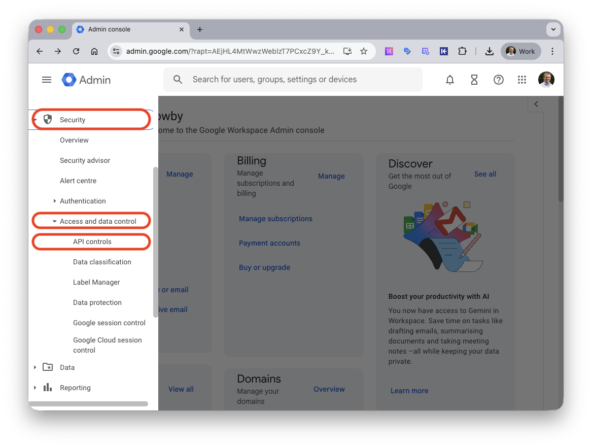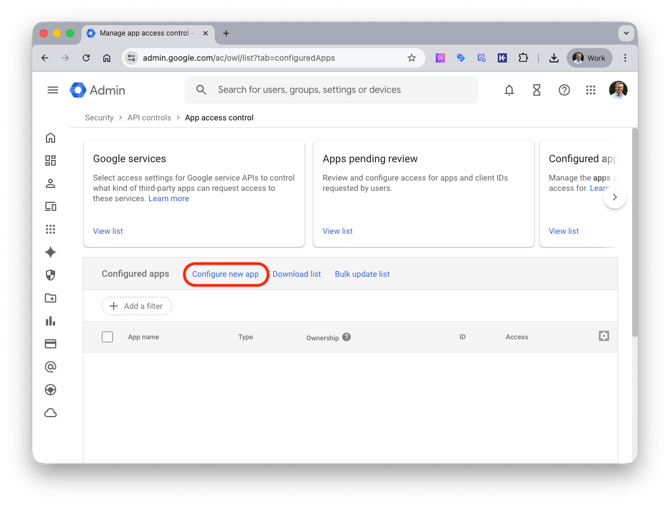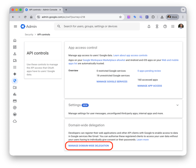 Manage Delegation: In the Google Admin Console, go to Security > Access and data control > API controls